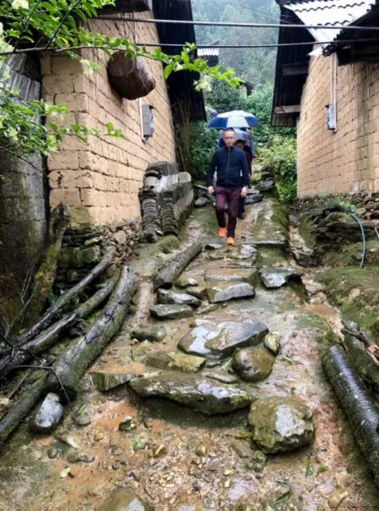 在老段的引领下,我们冒雨急前,小心翼翼地穿过流动在寨子中间的石头路。参差的石头,披着青色苔衣,镶嵌在雨后的泥水路面,形成淈泥滑石,踩踏之间,稍有不慎,定会重重地滑倒在地。