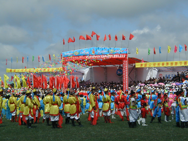 大草原最宜人的时节莫过于七八月。届时,蒙古族牧民们,就会穿上盛装,不管路途多远,男女老少,举家乘车骑马,云集到绿海如茵的草原上。世界各地的游人也会纷至沓来,素日宁静的草原顿时沸腾起来,蓝天白云之下,彩旗飘扬,人流涌动,羊欢马叫,呈一派繁荣景象。这就是蒙古民族一年一度的草原盛大节日——那达慕大会隆重开幕。