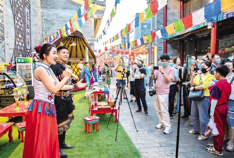 2020年6月19日,“乌兰牧骑月·一切为了人民”呼和浩特市直属乌兰牧骑走进大召直播活动在呼和浩特市玉泉区大召广场举行,乌兰牧骑队员在玉泉区通顺大巷为市民表演节目。