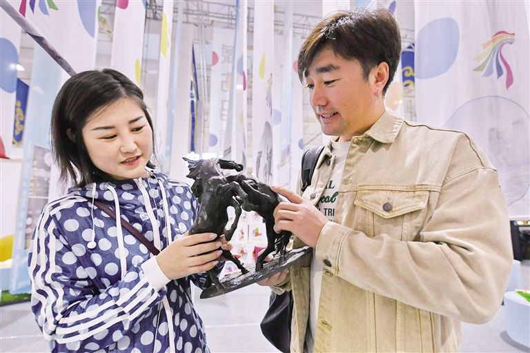 2019年9月20日至24日,第四届内蒙古自治区文化产业博览交易会在内蒙古国际会展中心启幕,观众在展会上欣赏马雕塑作品。