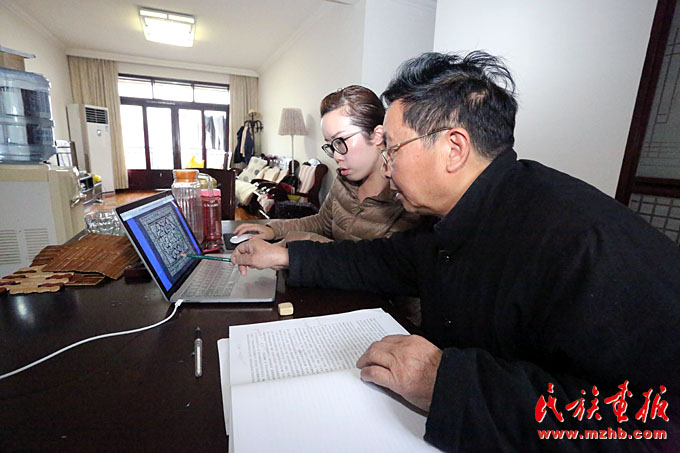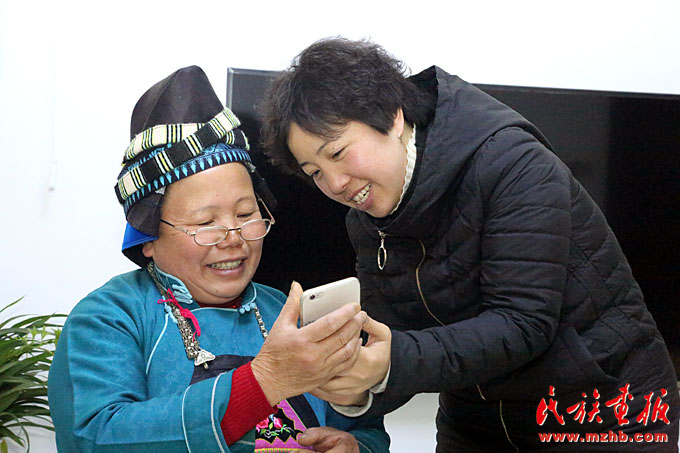 吴安丽向王阿板介绍新的蜡染图案