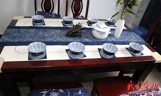 杨文斌老师和她的夫人梁定芳老师都是“非遗”传承人。现在他们忙着著书、讲学、开研讨会。谈起蜡染、谈起民族民间工艺,杨文斌老师滔滔不绝:“现在要从三个方面认识和研究民族民间工艺:一是从历史学、人类学、民族学的角度解读,二是从审美学、艺术视觉理念的角度解读,三是从工艺学、材料学、技艺学的角度解读。现在植物染料的加工和染色技艺消失得很快。老祖宗留下的宝贝到我们这代可不能扭曲和断裂。”