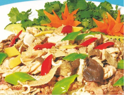 (1)将牛百叶肚涂上生石灰,稍腌片刻,用清水冲洗,漂净百叶外膜后,切成条状。草肚壁用刀拍打几下,拨去壁层黑皮及油膜,洗净后,与牛舌黄、里脊肉及牛肝分别切成薄片。牛腰片成两片,与牛心冠、蜂肚头、肚尖均剞上花刀,再切成块。以上各料均抹上少许精盐、淀粉搅拌腌制。