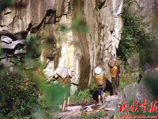 1988年独龙族所需的日常用品要靠背夫才能运送进高黎贡山,人们到达独龙乡依然靠双脚行走