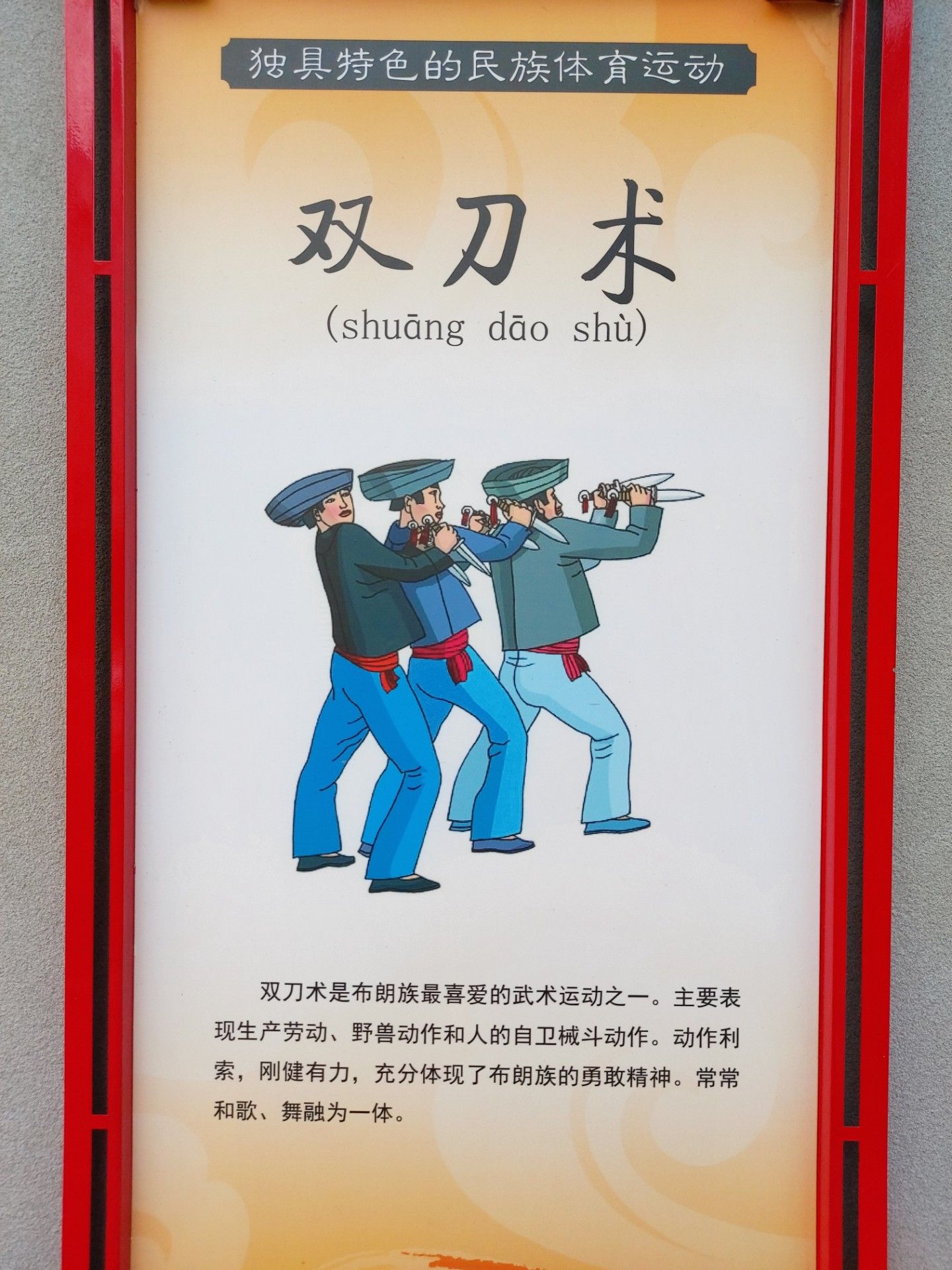 双刀术是布朗族最喜爱的武术运动之一。主要表现生产劳动、野兽动作和人的自卫械斗动作。动作利索,刚健有力,充分体现了布朗族的勇敢精神。常常和歌、舞融为一体。