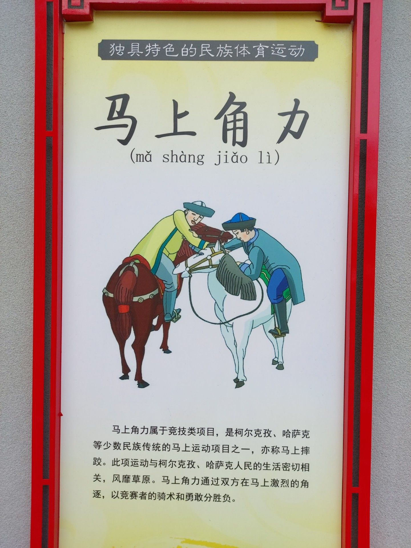 马上角力属于竞技类项目,是柯尔克孜、哈萨克等少数民族传统的马上运动项目之一,亦称马上摔跤。此项运动与柯尔克孜、哈萨克人民的生活密切相关,风靡草原。马上角力通过双方在马上激烈的角逐,以竞赛者的骑术和勇敢分胜负。
