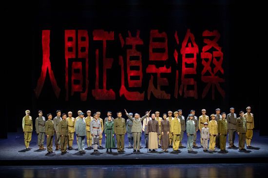舞台上方,3幅象征远去记忆的“残片”随剧情不断升降,20余年波澜壮阔的历史画卷次第展开;舞台中央,一个直径13米的转台如同历史的年轮,不停迁移着场景,将一幕幕故事推向高潮。剧终,“人间正道是沧桑”7个大字徐徐落下,演员随转台绕场一周,伴随着磅礴大气的音乐,留给观众震撼的观感和无尽的回味。