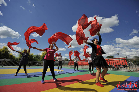 在丰宁满族自治县黄旗镇城根营村,村民在文化广场扭秧歌。(王立群 摄影)