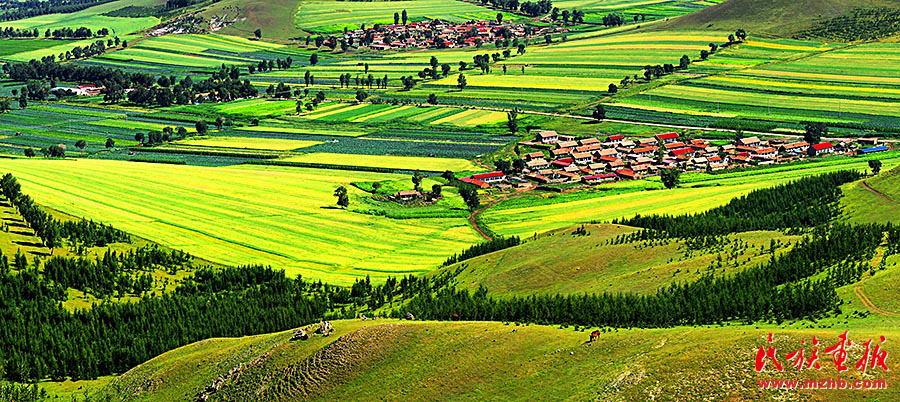 绿树掩映下的草原乡村。(王艳义 摄影)