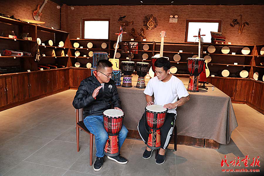 一位老师正在给新来的同事教非洲鼓的演奏方法。