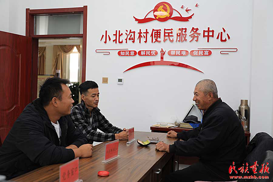 在便民服务中心,村委会工作人员阎万江(右一)与村民交谈。