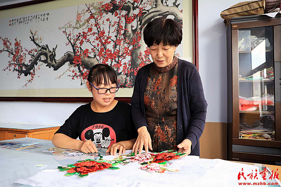 丰宁滕氏布糊画传承人滕艳春(右)指导工人设计布糊画样式。