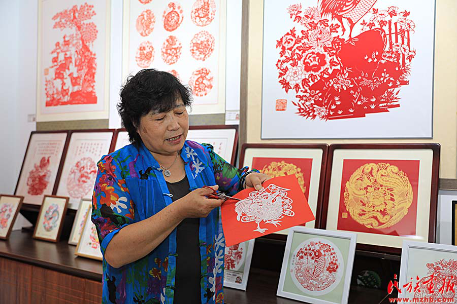 丰宁满族剪纸传承人石俊凤展示自己的剪纸作品。