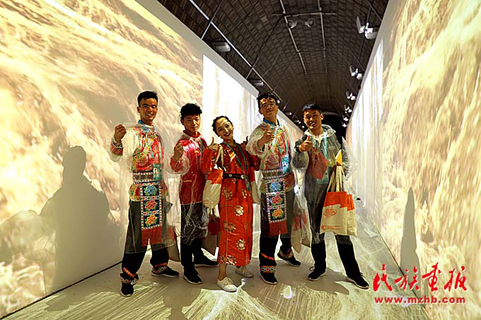 第十一届全国少数民族传统体育运动会举办期间,少数民族青年在黄河时空隧道留影。(民族画报记者 滕俊 摄影)