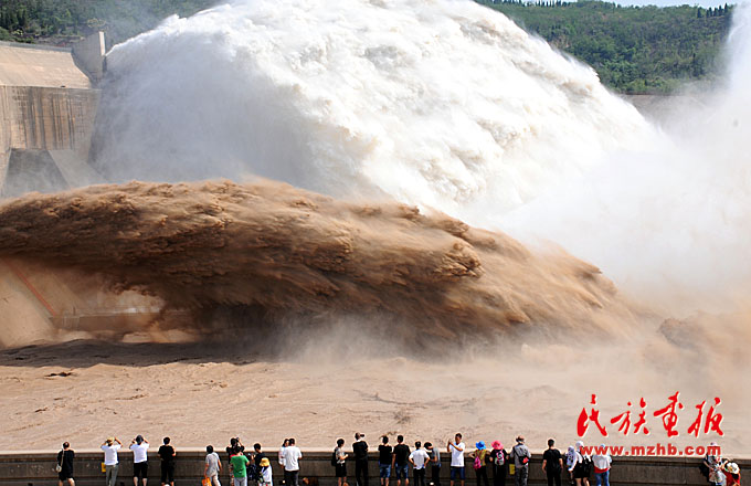 黄河小浪底水库下泄的清澈水流与裹挟泥沙的混浊水流分别从明流洞、排沙洞奔腾而出。图为游客在小浪底库区观看这一景观。(新华社发 苗秋闹 摄影)