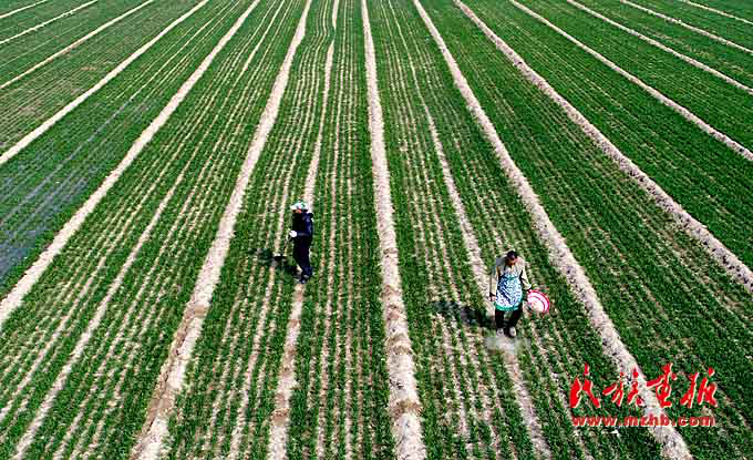黄河岸边农事忙。图为黄河北岸河南省温县赵堡镇的农民在麦田劳作。(新华社记者 朱祥 摄影)
