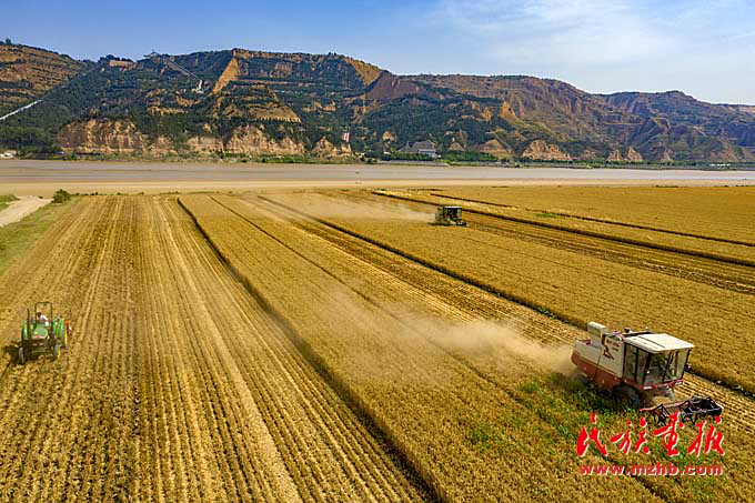 在黄河岸边的河南省三门峡市灵宝项生农业机械服务专业合作社的小麦田中,收割机在收获小麦。(新华社发 杜杰 摄影)