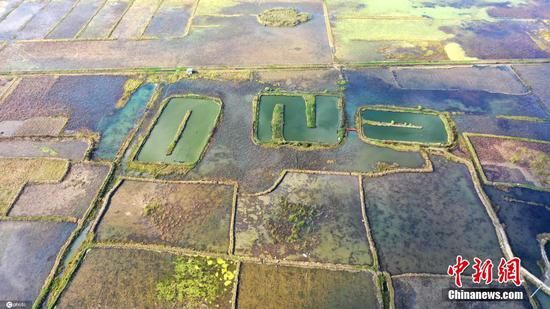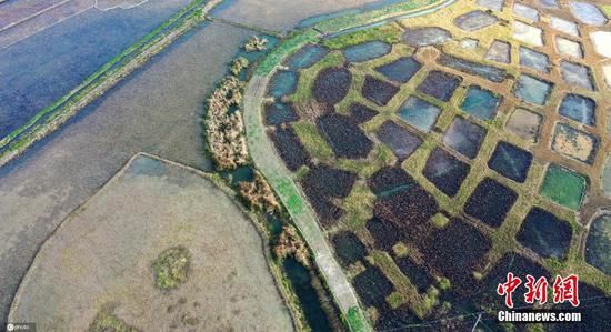 2021年12月6日,贵州省黔西南布依族苗族自治州安龙县招堤国家湿地公园荷塘色彩斑斓,从空中俯瞰,犹如调色盘,蔚为壮观。