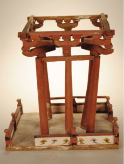 值得一提的是这件木亭模型的斗拱。它采用双层斗拱叠加装配的方法,镶于柱与梁之间,起到承上启下、传递荷载的作用。中国古代的大型建筑,都是由斗拱承上启下,左牵右拉,以达到稳固的目的,甚至可以抗击较强的地震。由于封建社会等级制度森严,只有宫殿、皇家园林、庙宇和有一定地位的家族的建筑上,才允许在柱上和内外檐的枋上安装斗拱。因此,斗拱层次的多少也可以反映出建筑物的重要性和拥有者的等级差别。