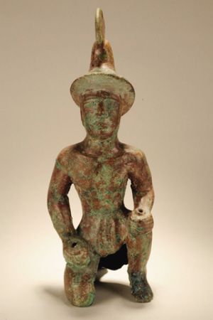 1983年8月,伊犁哈萨克自治州新源县巩乃斯河南岸的古代乌孙土墩墓葬中,出土了距今2000多年的铜武士像等珍贵文物。这批文物的出土地点位于新源县城东北部大约20公里处,即新疆生产建设兵团农四师七十一团场一连渔塘旁边的一排南北向并列的古代土墩墓中。当农场职工用推土机平整土地时,发现了这批历史文物。墓葬出土的铜武士像高40厘米,重6.25公斤,为红铜质。其头戴宽沿尖顶弯曲高帽,长长的鬓角,深目高鼻。左腿曲起,右腿下跪,两手呈握拳状,分别置于左右两腿上,拳心相对,拳眼向上。手中各有一孔管,原植入物件可能是刀剑之类的武器。