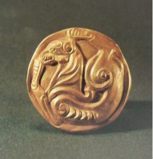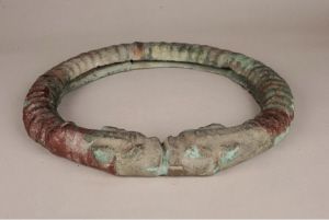 此外,考古人员还在新源县巩乃斯河南岸发现了两件大铜环。一件铜环上铸着两只怪兽。怪兽带有翅膀,面对面,模样像虎,所以该铜环又被称为“对虎铜圈”。另一件铜环上也铸着怪兽,但不知是什么动物,称之为“对兽铜环”。专家们猜测,这两件铜环可能是塞种人首领在祭祀等重大活动时戴在脖子上的项圈,用来表示身份和权力。