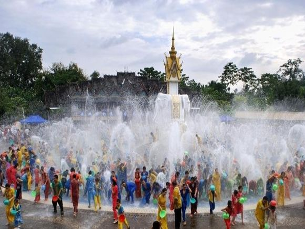 泼水节一般在风光旖旎的澜沧江畔举行。当晨曦映红“黎明之城”的时候,各族群众便穿着盛装,从四面八方汇聚这里。一声号令,一支支高升腾空而起,直穿云霄,一艘艘龙舟箭一般,直冲对岸。此时,千万只金竹“(上竹下必)”一起吹奏、铓锣、象脚鼓一齐敲响,澜沧江两岸顿时变成欢乐的海洋。