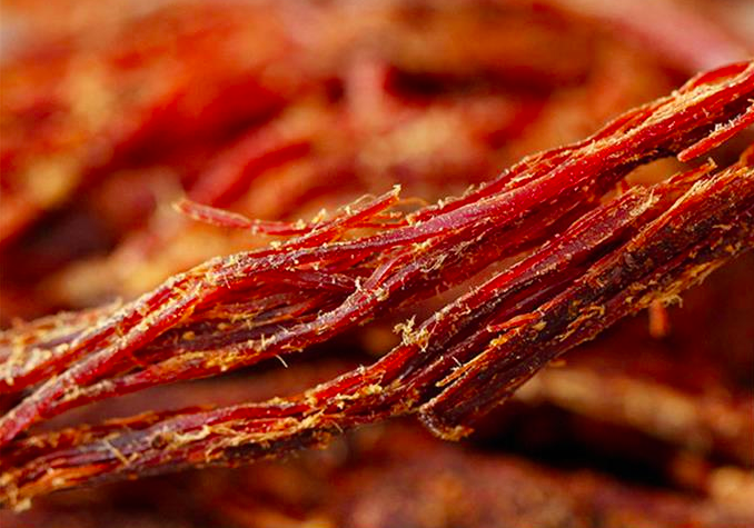5、捶:将刮干净的干巴置于砧板,用特制的木捶四周捶,用力要猛,要准,同时要注意安全,捶数下,待干巴的呈细丝状,取出。