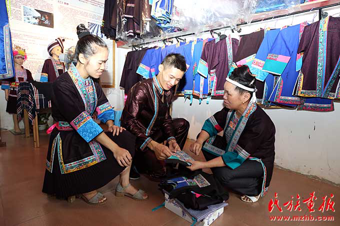 一项技能,也能带动周边脱贫致富。从洋溪乡信洞村到县城开办先荣侗艺服装店的杨先荣,靠制作侗族服装,自己致富的同时带动其他人脱贫。在制作服装的同时她还在传授技艺,今年8月,在村上组织了一期侗族服装加工制作技艺培训,很受村民欢迎。要到南宁参加大学同学会的吴镇宇在店里花三百多元买了一套两件套的衣服,他向记者说:“我穿自己民族的服装参加聚会,能给大家留下深刻印象,而且我穿这衣服很帅!”杨先荣的女婿廖继美,今年27岁,湖南邵阳人,他在河池学院读书时认识了杨先荣的女儿。现在杨先荣已经把很多侗族服饰制作技艺传授给了廖继美。