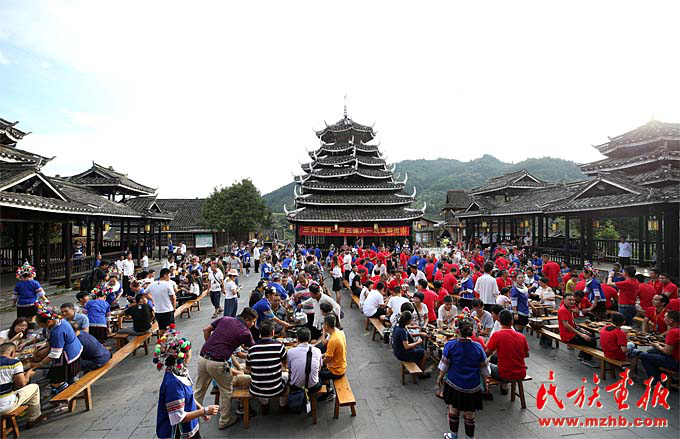 三江县林溪乡冠洞村冠小社区的侗族百家宴,可谓远近闻名。在寨子鼓楼旁的广场上,全村老少先是给游客表演侗族的歌舞和自己编排的展示民族生产生活的文艺节目,节目结束后,在广场上把桌子和凳子摆放好,各家把精心准备的饭菜和酒摆上桌。色香味美的佳肴吸引着众人,一时间广场成了欢乐的海洋,人们手里拿着碗筷,走桌串座。席间会有热情的村里人敬酒,高山流水的敬酒方式会给人留下深刻的印象。“侗族百家宴参与性强,印象深刻,我也是第一次体验,非常开心!”柳州客人潘忠义激动地告诉记者。