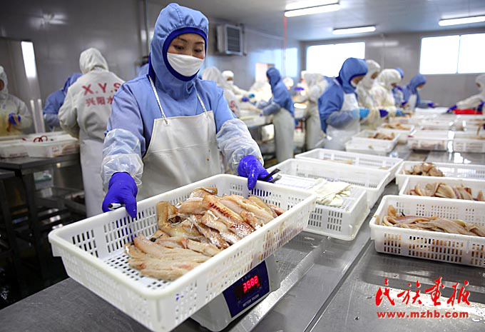 在珲春市边境经济合作区内的海产品加工车间,工作人员正在加工出口俄罗斯的产品。