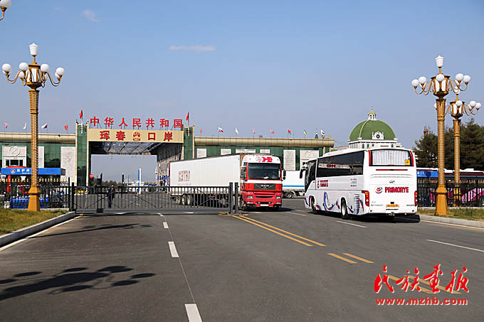 不断有旅游大巴和货车在珲春口岸驶过。(民族画报记者 陈涛 摄影)