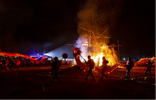 更具特色的要数正月十五赶毛狗子了。传说毛狗子(狐狸的俗称)喜欢偷鸡吃,所以必须得赶走。赶毛狗这一天,亲朋好友聚在一起,先用竹筒做成火把或用木梓油做成灯备用,再砍树枝搭成棚子,放入草扎的毛狗子,堆放未破节的竹筒和火炮树叶。待天黑,男女老少全部出动,在屋边及路边插上点燃的火把、灯,然后烧燃毛狗棚,这边的人群发出“哦嗬”声,那边的人群高喊“赶毛狗子哟!”此时,满山遍野火光冲天,叫喊声此起彼伏,震耳欲聋,热闹非凡。