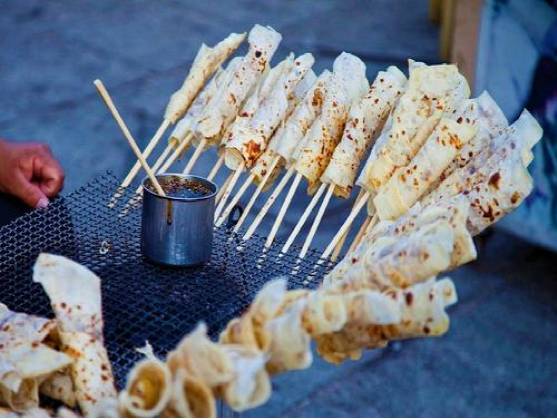 桃仁夹沙乳扇是白族风味菜。将乳扇回软,去掉扇耳,摊开。把桃仁用 沸水烫后去细皮,下油锅炸成金黄色,捞出沥干油,将洗沙、白糖、玫瑰糖、火腿末入碗拌匀。鸡蛋液加水淀粉成蛋糊,制成蛋松。乳扇铺在墩上,摊 上洗沙馅。锅上火注入油,烧至三成熟,用筷夹住乳扇,边炸边滚至筒形,呈淡黄色。桃仁夹沙乳扇,酥脆香甜,奶香异常,富于营养。如果你到大理,走到街头你随处都可以买得到,新鲜乳扇或烤乳扇。