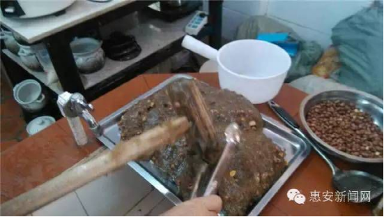 薯粉调味、加水勾芡、干炒花生米、入锅力乾,木制的薯橹在壮实的大嫂手中沿顺时针不停地乾(用力搅拌),薯粉糊由稀变稠,由白色变为有点透明的灰褐色。在其半熟状态,倒入干炒花生米,再继续乾,直至花生米均匀地与薯粉粘在一起。薯粉熟透了,起锅装碗。再烧制由高丽菜、小肠、海蛎做出的汤汁,淋在碗中薯粉团上。